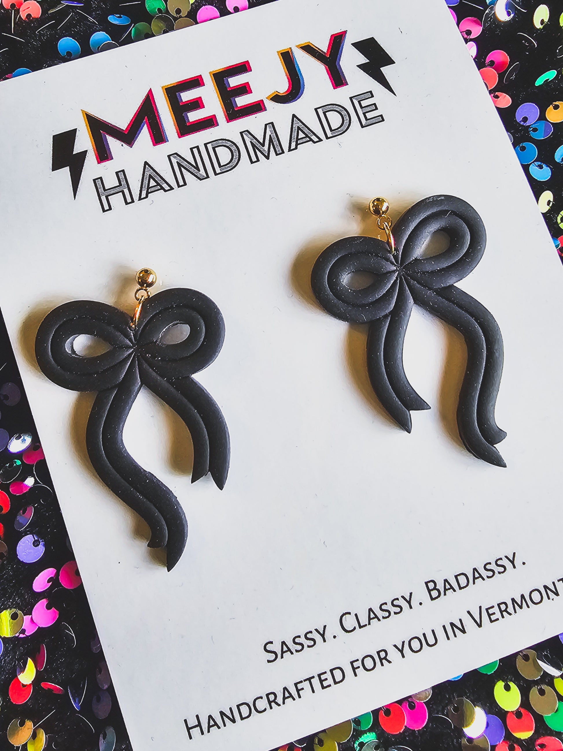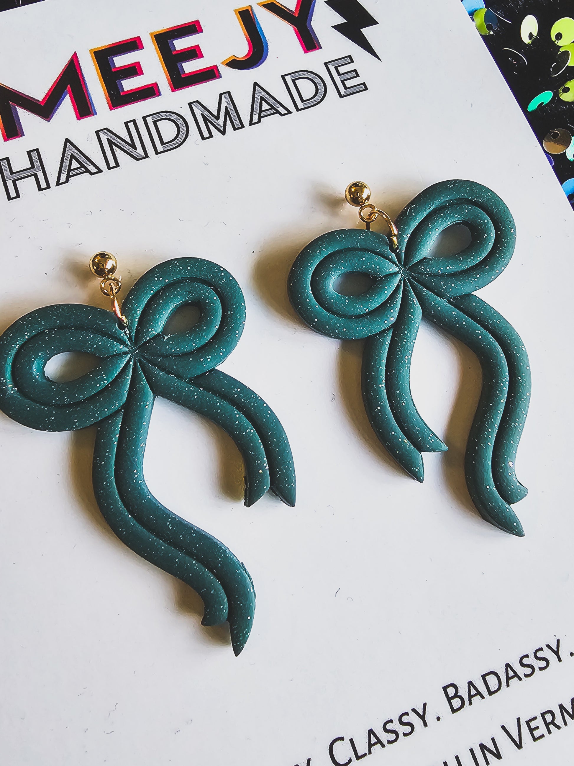 Beautiful polymer clay bows that are perfect for the festive season. Made with gold-plated surgical stainless steel posts and gold plated jump rings. Available in black, green, red and gold glitter.