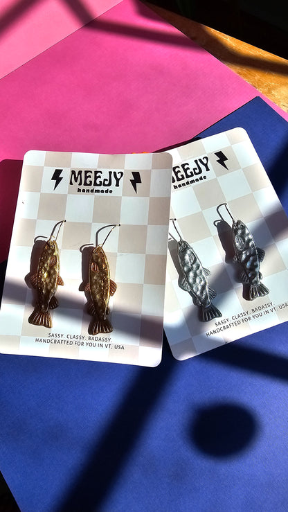 Faux hammered brass and silver trout fish made with lightweight polymer clay. Details on each brass fish are highlighted with metallic ink while the silver is as is. These hooked cuties hang on a gold plated surgical stainless steel hook or plain surgical stainless steel hook... just like the real deal.