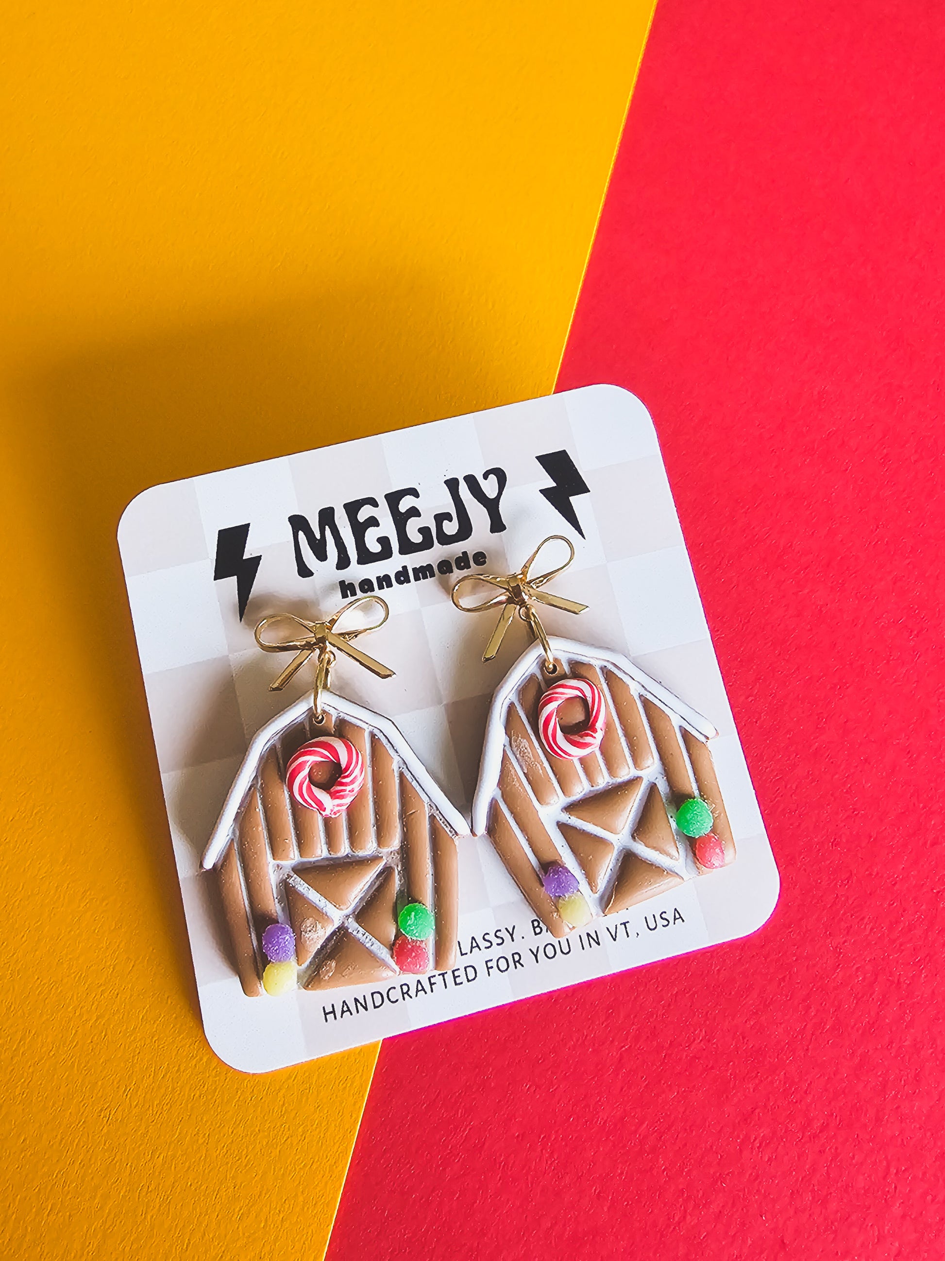These gingerbread barns are a cute new take on gingerbread houses.  Made from polymer clay, these barns have a candy cane wreath and gumdrop trees.