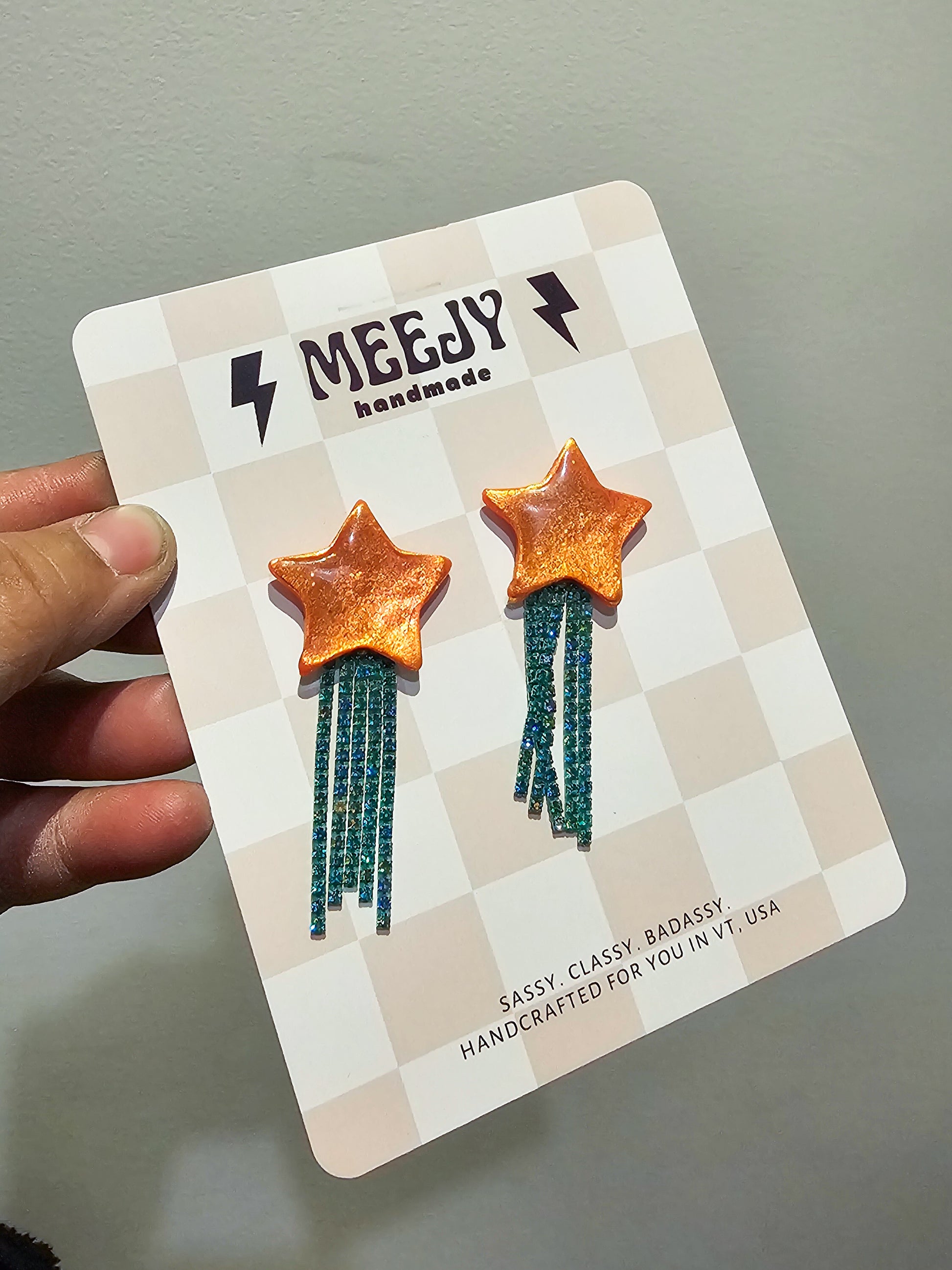 Make a statement with these large stars featuring dazzling rhinestones that sparkle with movement.  These polymer clay earrings feature a hypoallergenic, surgical stainless steel post attached with resin.