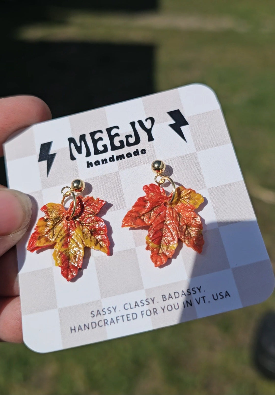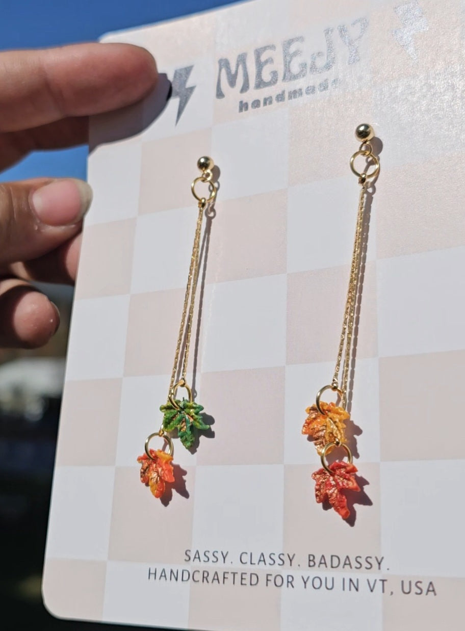 Fall in love with these polymer clay maple leaves which are as colorful as the fall foliage in the mountains of Vermont! Available as single leaves or a tassel of leaves, each pair is unique with its own color variations.  Choose from green (which have more green and yellow) or red (which have more red, and orange) for the single leaves.
